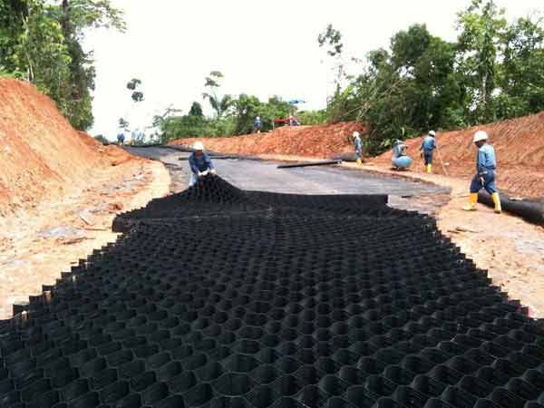 土工格室是由高強度的HDPE寬帶,經過強 力焊接而形成的一片網狀格室結構。它伸縮自如,運輸時可縮疊起來,使用時張開并充填土石、或混凝土料,構成具有強大側向限制和大剛度的結構體。它可用來做為墊層,處理軟弱地基的承載能力,也可鋪設在坡面上構成坡面防護結構,還可以用來建造支擋結構等。施工方便快捷。